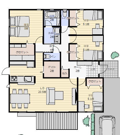33坪と比較的コンパクトでしっかり4 部屋で家族が多い場合でも対応できるし