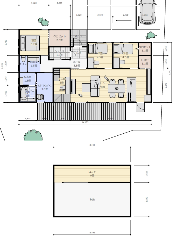 中二階のある平屋の間取り図 蔵収納のある住宅プラン 平屋間取り 4年前 ※土地の大きさ 74.23坪 ※中二階がある平屋建て ※建物の規模29坪程度 ※必要な部屋 子供部屋が将来区切れる 4.5×2で9畳ほしいです LDK20畳 子供部屋と主寝室は離してほしいです 主寝室はウォークインクローゼット含め5畳程度 キッチンは対面キッチン リビングに中二階(3畳)ほしいです 駐車場4台 家族構成 家族は4人で夫婦と子供が2人です。