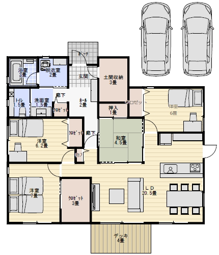 南の方にリビングダイニングキッチン20畳が配置されていて、