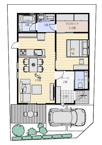 夫婦で住む小さな平屋の間取り 平屋間取り 4年前 いつも楽しく拝見してます。 早速ですが13坪の土地でLDkと寝室が北側、 南東側にサンルー厶、 並んで洗濯機、 洗面トイレ、 浴室が並んでおり玄関、 納屋希望です。 南側と東に道路があります。 東方向が約10メートル 南側は約7メートルです。 主人と2人暮らしで寝室とリビングがあれば充分です。 LDKは南側希望です。