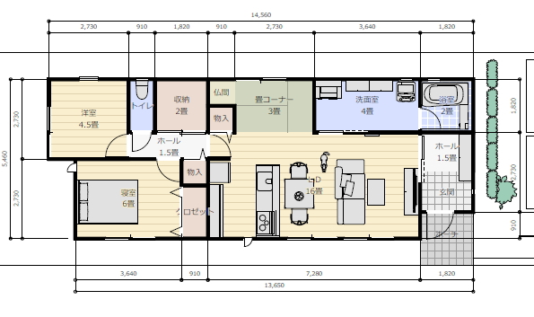 夫婦で住む小さな平屋の間取り23坪3LDK 平屋間取り 4年前 間口3間、奥行き15間 東道路 現在納屋が立っているところを解体した跡地に 平屋を建てたいです。 23坪 必要な部屋として 6畳寝室、4.5畳予備部屋、パントリー、 畳コーナーに仏壇、洗面所と 広めの室内物干し場など要望はほぼ叶えられているのですが、、、 夫婦二人40代半ばの終の住処です。 1番日当たりのいい南面に畳コーナーがある事と 調理中に、テレビが見れないなど細かなことを どう解決すれば良いかが分かりかねてます。