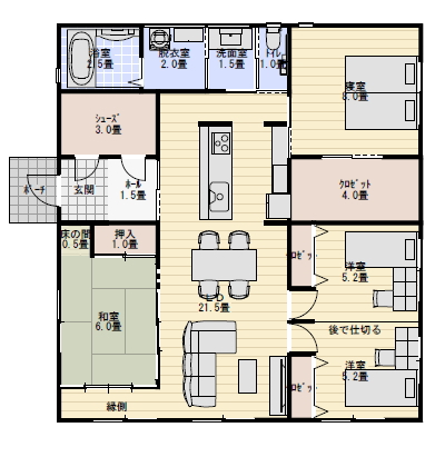 南の方に後から仕切るタイプの子供部屋が2つ配置されています。