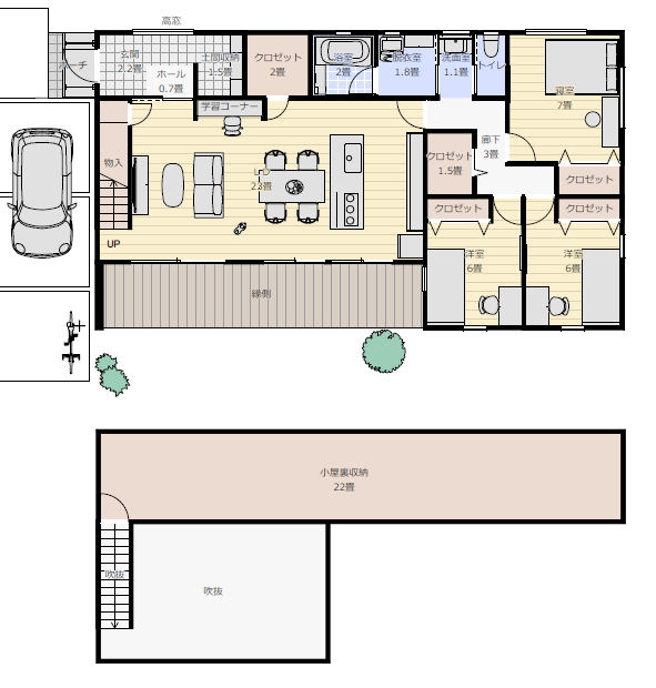 屋根の高いところにロフト収納、階段であがるロフト収納が付いています。