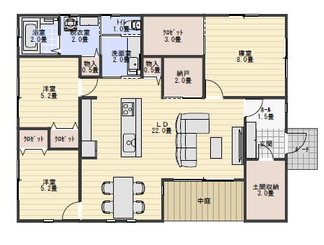中庭があるので周りを少し囲まれても光を入れられるプランにもなります。